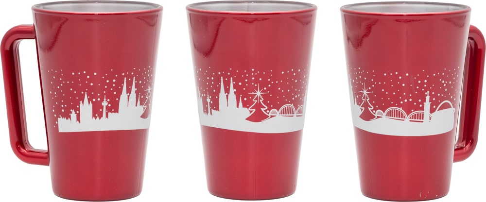 Die lackierte Glastasse zeigt die wunderschöne Kölner Skyline samt Dom. Mit ihrer roten Außenseite und der silbernen Innenseite bringt sie winterliche Gemütlichkeit in jedes Zuhause.